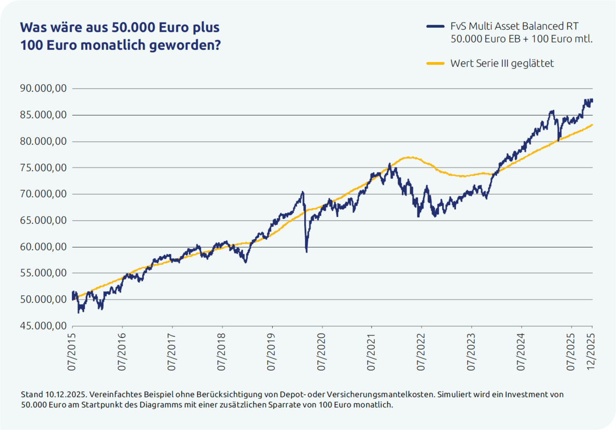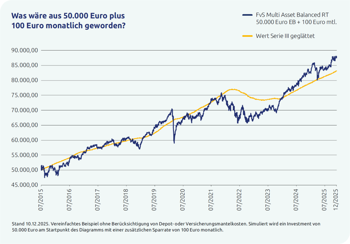 In unserem vereinfachten Beispiel ohne Berücksichtigung von Depot- oder Versicherungsmantelkosten simulieren wir ein Investment von 50.000 Euro am Startpunkt des Diagramms mit einer zusätzlichen Sparrate von 100 Euro monatlich.